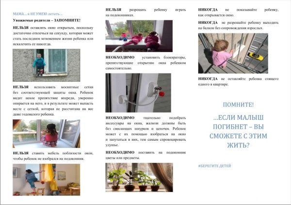 Ежегодно с началом летне-весеннего сезона регистрируются случаи гибели детей при выпадении из окна! Как правило, во всех случаях падения дети самостоятельно забирались на подоконник, используя в качестве подставки различные предметы мебели, и, опираясь на противомоскитную сетку, выпадали из окна вместе с ней. При этом подавляющее большинство падений происходили из-за недостатка контроля взрослыми за поведением детей, рассеянностью родных и близких, забывающих закрывать окна, отсутствие на окнах блокираторов или оконных ручек-замков, неправильной расстановкой мебели, дающей возможность детям самостоятельно забираться на подоконники, и наличие москитных сеток, создающих иллюзию закрытого окна.